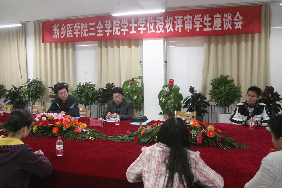 上午9时,新乡医学院三全学院申请学士学位授权评审工作汇报会在国际饭店第三报告厅召开。新乡医学院副院长毛兰芝,我院董事长陈逸飞及党政领导班子,新乡医学院基础医学院副院长杨保胜教授,生命科学技术系主任丰慧根教授,医学检验系主任王辉教授、副主任王明永博士,第一临床学院副院长郭明好教授,我院中层以上干部参加了汇报会。汇报会由我院党委书记王志凯主持。