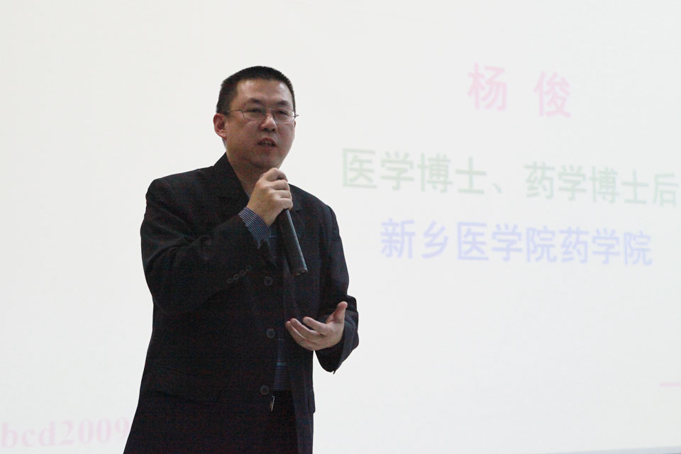 10月19日晚,新乡医学院药学院院长杨俊教授在问学楼T教室做了一场题为“从人生经历谈如何确定奋斗目标”讲座。我院院长杨捷,团委、各院系相关负责人及500余名师生共同聆听了本次讲座。 杨俊:医学博士、药理学博士后,特聘教授、主任药师、研究员、教授级高工、博士生导师。现任新乡医学院药学院院长、加拿大国家研究院高级研究员、中国药物制剂新技术国家重点实验室主任、河南省药理学重点学科学术带头人,河南省神经精神药理研究院士工作站负责人等职,兼任国家新药审评专家、国家知识产权局审评专家、中国林业学会林木提取物利用分会副理事长、河南省药理学会副理事长、湖南省发明协会副理事长等,同时还担任《Journal of Pharmaceutical Medicine》主编、《Journal of Intellectual Property》主编和《国际神经精神科学杂志》主编,曾担任世界500强企业――美国强生集团和美国雅培大药厂资深科学家和医药总监,主要从事神经精神药理研究和新药开发,承担国家级重大课题5项,省部级课题8项,获国家科技进步奖2项、省部级科技进步奖3项,授权发明专利27项、新药证书15件,以第一作者或通讯作者发表学术论文200余篇,其中SCI收录71篇。 杨俊还入选江苏省引进高层次创新创业人才计划和湖南省引进海外高层次人才“百人计划”,获得2010年湖南省第五届“潇湘友谊奖”和2012年河南省“黄河友谊奖”。