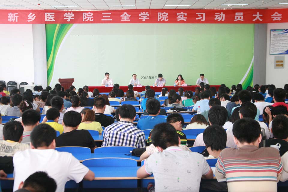 本网讯  521日上午,我院2012年实习动员大会在问学楼T教室召开。我院副院长王维勋,新乡医学院第三附属医院泌尿外科主任郑航,我院学务部主任助理韩丽出席,教务部和就业指导服务中心相关负责老师及200余名学生代表参加会议。会议由教务部朱坤主持。