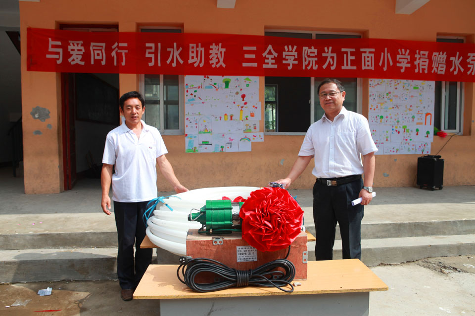 宋东生感谢我院师生的无私支援与帮助。他说,正面村小学用水困难,全校师生全靠校园内一口水窖维持生活。水从校园外的仓河抽取,距离水窖150余米,每年的水泵租金要花费上千元。三全学院捐赠水泵,将有效解决这一难题。他感谢我院师生的支教帮扶,祝愿三全学院越办越好。