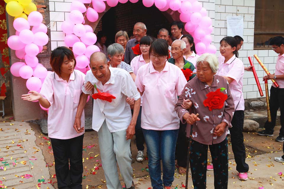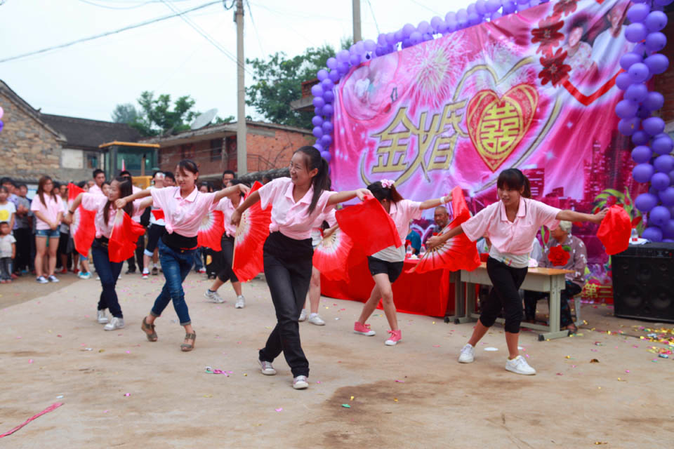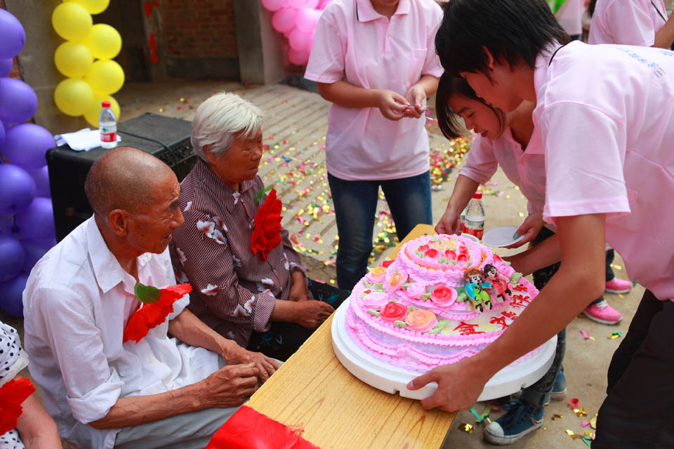 我院师生向金婚老人呈上代表着生活甜美的金婚蛋糕并送去补养品,现场鞭炮、彩花弹齐鸣,孩子们、乡亲们争抢喜糖。我院师生与当地村民带来欢快的秧歌舞,老人们品尝着蛋糕,脸上洋溢着笑容。