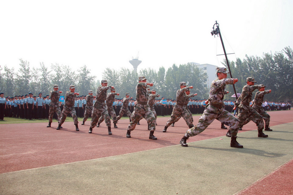 会演除了同学们的精彩表演外,还有教官的军体拳表演和来自解放军某部队士兵的队列表演,教官们英姿飒爽,动作娴熟,标准一致,表现出军人刚强的体魄与顽强的精神,赢得了在场观众的阵阵喝彩。