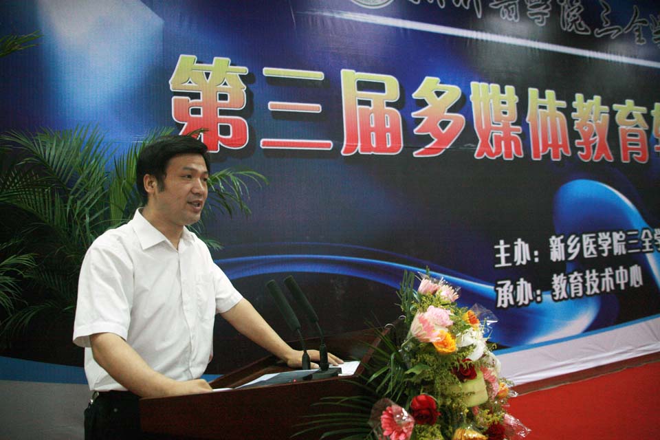 本次大赛组委会主任、学院副院长王彦杰为大赛致辞。他首先代表三全学院全体领导班子对各位专家的到来表示热烈的欢迎。王彦杰说,全国多媒体教育软件大赛是在全国、全省教育信息化领域中一项涉及面广、参与度高的重量级大型品牌赛事,我院秉承大赛的宗旨,创新性地于2010年、2011年连续举办了两届,选拔的作品在全省、全国取得了可喜的成绩,大赛对促进信息技术与学科教学整合、提高学院教育教学质量、推进教育信息化产生了积极而深远的影响。他指出,本次大赛组织设计上与前两届相比有三点创新:一是采用以教学课程为单元,遵循学科特点进行推荐和选拔,更科学,更公平,更有学习价值和借鉴意义。二是大学生除了当评委,还可以直接参赛,引导大学生树立新型的学习理念,培养创新精神。三是采用推荐―选拔―盲评―决赛―宣讲穿插的大赛新模式,即以大赛带动学习,以学习推动技术,以技术提升效果,以效果催生质量。最后,他希望参赛选手在参与中学习,在点评中提高,在比赛中进步。
