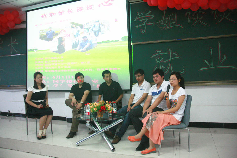 华中科技大学协和医院小儿外科、临床医学博士王新星,湖北英山县公安局肖国芳,解放军第三七一医院CT、MRI室李学坤,第三军医大学在读研究生李光耀、孙珂岱等5名优秀毕业生回母校做客谈心。五位毕业生分别分享了自己的大学生活经历,并针对学习、参加活动、考研与实习、处理感情等问题,向学弟学妹们提出建议。