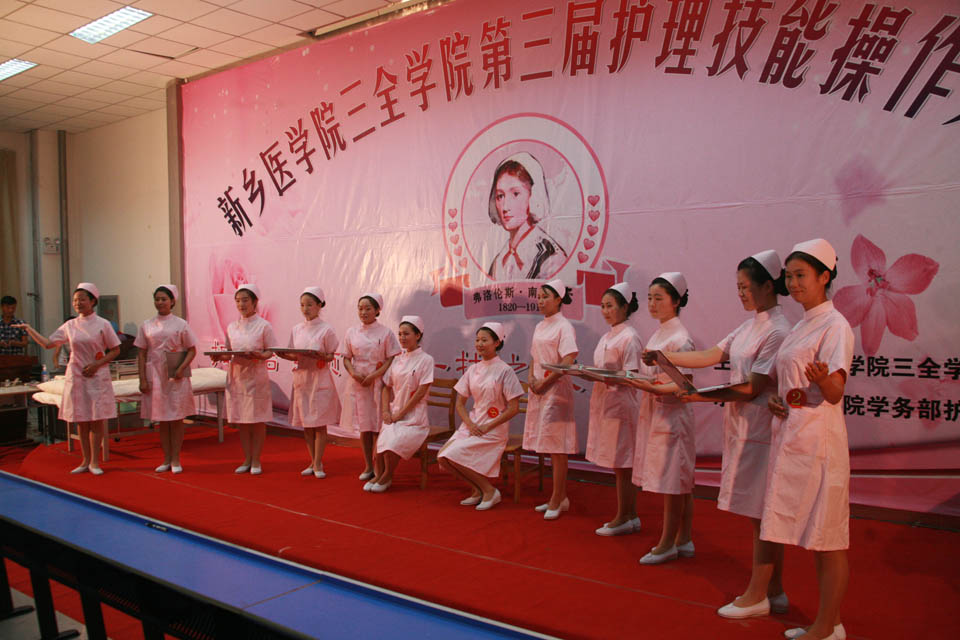 本网讯 5月25日晚,我院在问学楼T教室隆重举办第三届护理技能大赛。大赛特邀郑州市中心医院护理部主任杜慧萍,新乡市中心医院护理部主任朱智玲,新乡医学院第三附属医院主任王自然担任评委。新乡医学院护理学院副院长薛松梅、我院副院长王维勋出席,护理专业分部主任马素娟,教务部实习科朱坤及护理专业分部600余名师生参加。