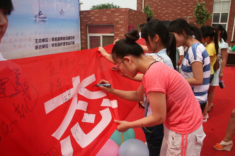 现场同学共同放飞心愿气球,无数彩色气球冉冉飞向蓝天。在院领导带领下,同学们纷纷在印有“健康心态,共享五月”的条幅上签名。