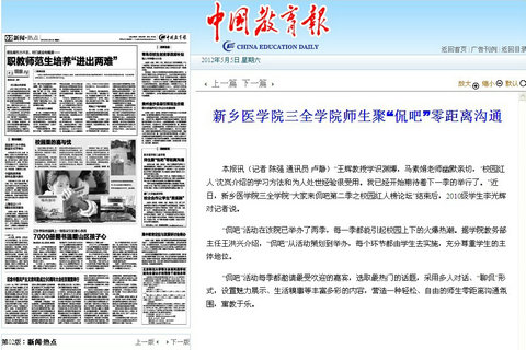 本网讯 5月5日,《中国教育报》在当日出版的报纸2版“新闻•热点”以《新乡医学院三全学院师生聚“侃吧”零距离沟通》为题,报道我院举行的“侃吧”活动,每季都邀请最受欢迎的嘉宾,选取最热门的话题,采用多人对话、“聊侃”形式,设置魅力展示、生活糗事等丰富多彩的内容,营造一种轻松、自由的师生零距离沟通氛围,寓教于乐。