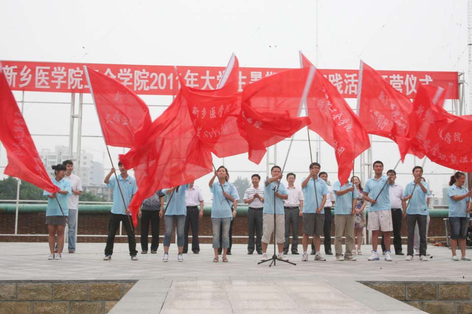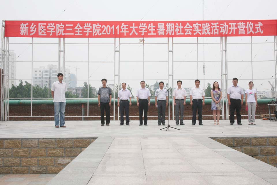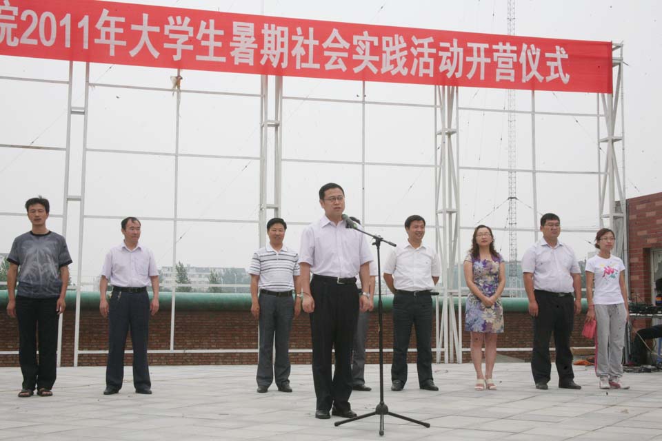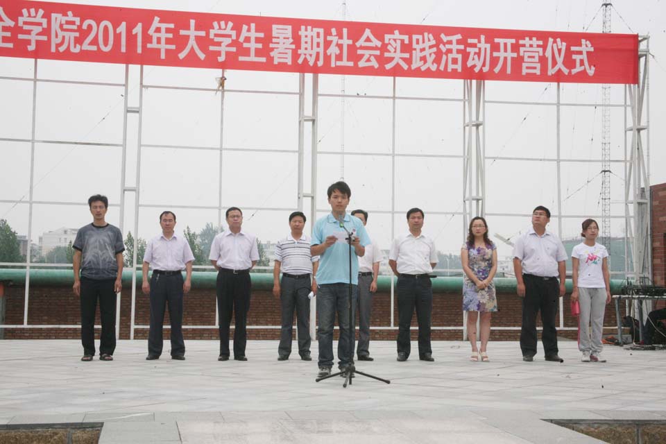 几位院领导和团委、资讯中心、总务部负责人为10支实践队授旗。院长杨捷宣布我院2011年大学生暑期“三下乡”社会实践活动开营。