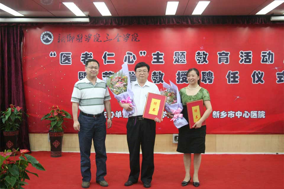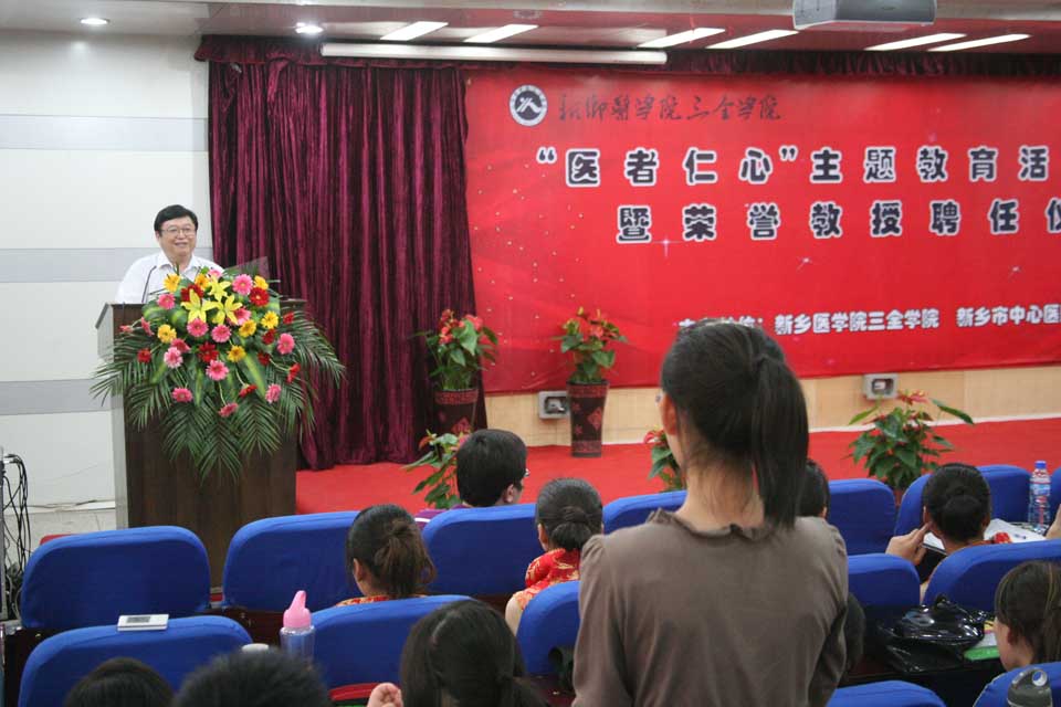 本网讯 5月18日下午,我院“医者仁心”主题教育活动启动暨荣誉教授聘任仪式在北校区研究生学术报告厅隆重举行。新乡市人大常委、新乡市中心医院院长、党委书记谢振斌,新乡市中心医院科教处主任、精神内科主任王夏红,我院党委书记王志凯,院长杨捷,党委副书记王金文出席,200多名师生代表参加了启动仪式,大会由学务部主任张钢主持。