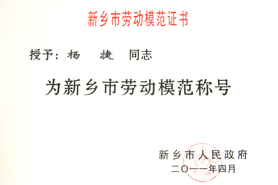 我院院长杨捷荣获“新乡市劳动模范”荣誉称号