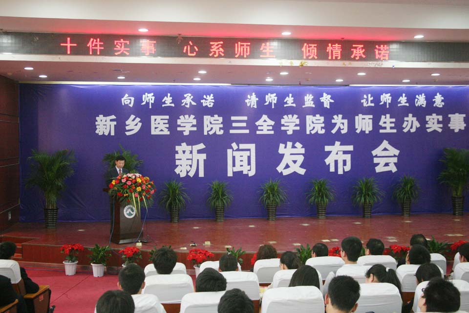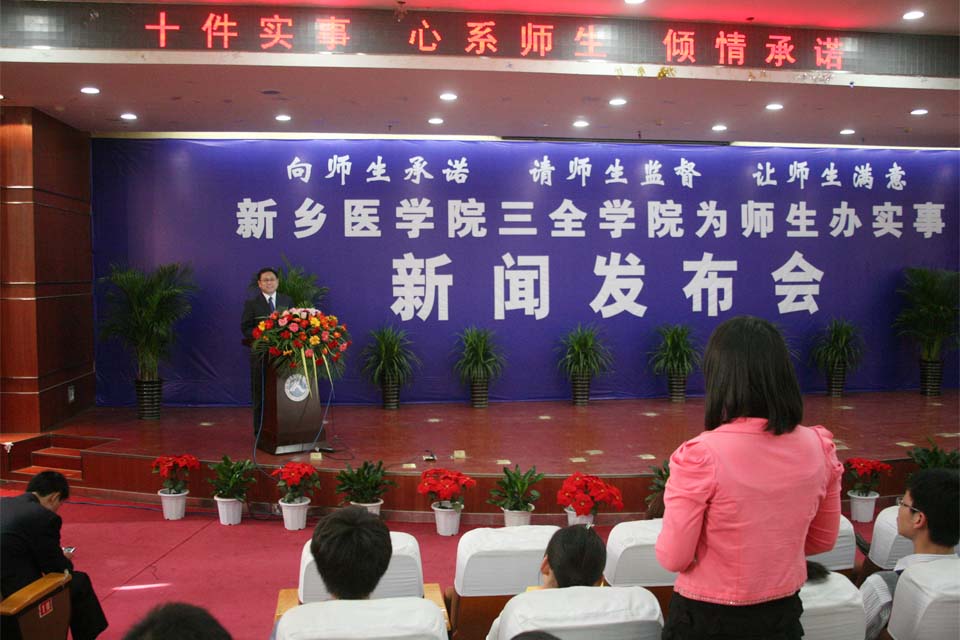 本网讯 4月25日下午三点,我院“为师生办实事”新闻发布会在第三教学楼第一报告厅举行。新乡医学院党委副书记、纪委书记郑怀庆,我院领导王志凯、杨捷、王金文、王维勋、王彦杰、沈雁霞出席,各部门主管、教职工、学生代表500余人参加,出席本次新闻发布会的还有河南日报、新乡日报、新乡电视台、新乡教育电视台等新闻媒体记者。发布会由院长办公室主任马波主持。
