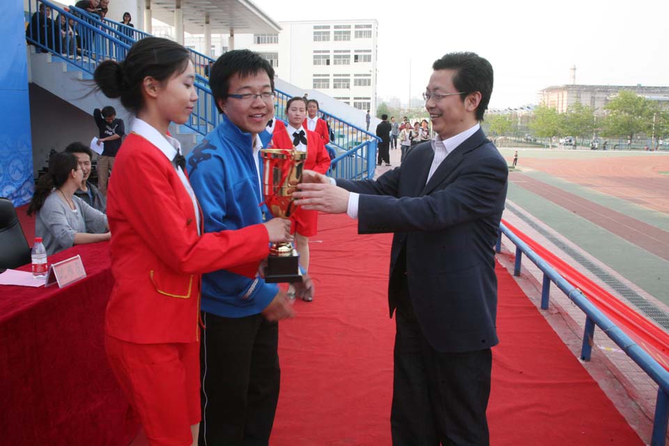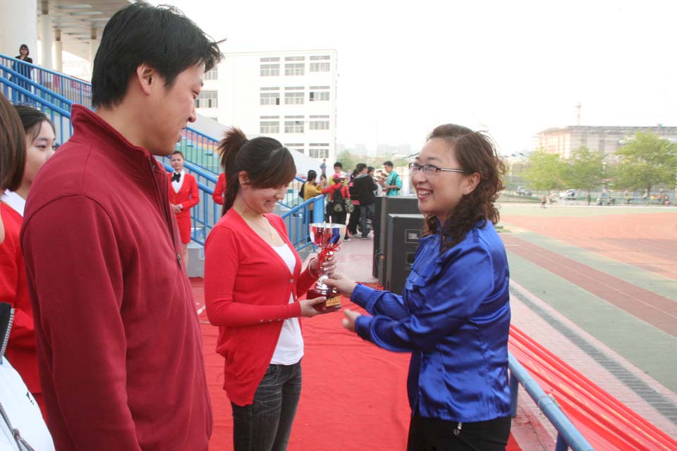 我院体育运动委员会办公室主任张钢宣布各项比赛成绩,然后出席领导向获奖运动员代表颁奖。最后,王金文宣布我院第四届运动会闭幕。