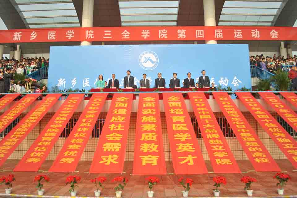 本网讯 4月23日上午,南校区运动场彩旗飘扬,人潮涌动,新乡医学院三全学院全体师生精神抖擞,欢聚一堂,共迎学院第四届运动会盛大开幕。新乡医学院三全学院党委书记王志凯、院长杨捷、新乡医学院体育教学部直属党总支书记、体育教学部主任王苏杭、学院党委副书记王金文、副院长王维勋、王彦杰、沈雁霞出席开幕式。