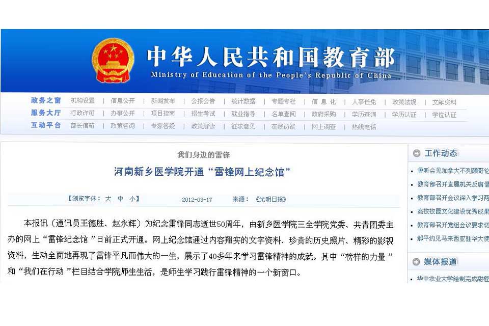 【中华人民共和国教育部网】中华人民共和国教育部网站报道我院开通“雷锋网上纪念馆”