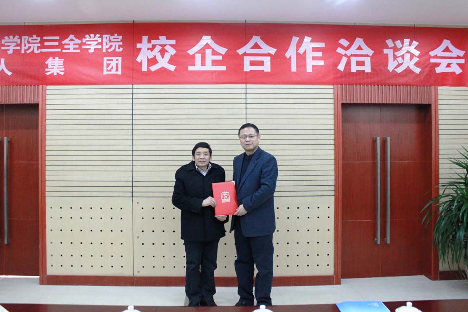 本报讯 2月22日上午,驼人集团董事长王国胜先生、副总裁张庆文先生一行7人来我院,与我院洽谈订单联合培养、设立专项奖学金等事宜。我院院长杨捷、副院长王维勋、王彦杰接待了王国胜一行,教务部主任王洪兴、学务部主任张钢、就业指导服务中心主任樊永兵参加洽谈。