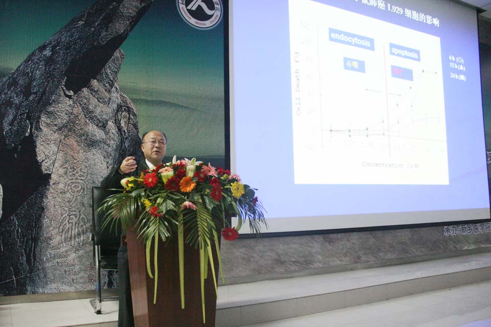 池岛乔教授主要围绕“自噬增强冬凌草甲素诱导的人组织淋巴瘤U937细胞吞噬凋亡小体的研究”进行阐述。他结合PPT展示图解对免疫药理学,免疫药理学研究的炎症、癌症、衰老产生机制,凋亡、自噬、坏死、吞噬和抗衰老信号的机理作了详细阐述。高深的学术造诣、渊博的知识让在场师生对免疫药理学及学术性研究有了更深一步的认识,开阔了视野,现场掌声不断。