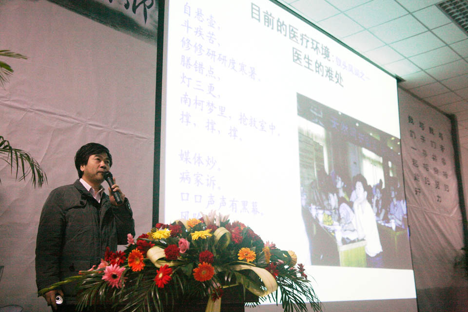 讲座上,郭教授从医生这一职业、目前的医疗环境、医患关系矛盾的成因、医患矛盾缓解的出路、新形势下成熟医师的标准、行医技巧等六个方面对如何做好一名医生进行了全面深入的阐述。郭教授指出,“行医是一种艺术而非交易,是一种使命而非行业”,并强调“一名医生,无论学位高低,一定要有五到十年的临床经验”。在分析医患关系矛盾的成因及缓解的出路时,郭教授分别从医生、患者、社会、新闻媒体等角度进行剖析,见解独特;对于新形势下成熟医师的标准,他表示,一名成熟医生的最低的境界就是获得病人的信任,想要成为一个成熟医生不但要有扎实的技术水平、丰富的临床实践经验,还应有高度认真负责的态度、强烈的责任心、养成终身学习的习惯;要胆大心细,仔细观察,认真学习请教其他医生的经验。整场讲座郭教授言辞犀利、旁征博引、风趣幽默,不时引来在场观众的掌声、欢笑声。最后,郭教授同现场同学积极互动,将气氛推向高潮。