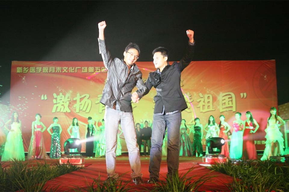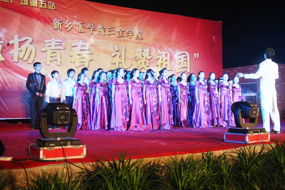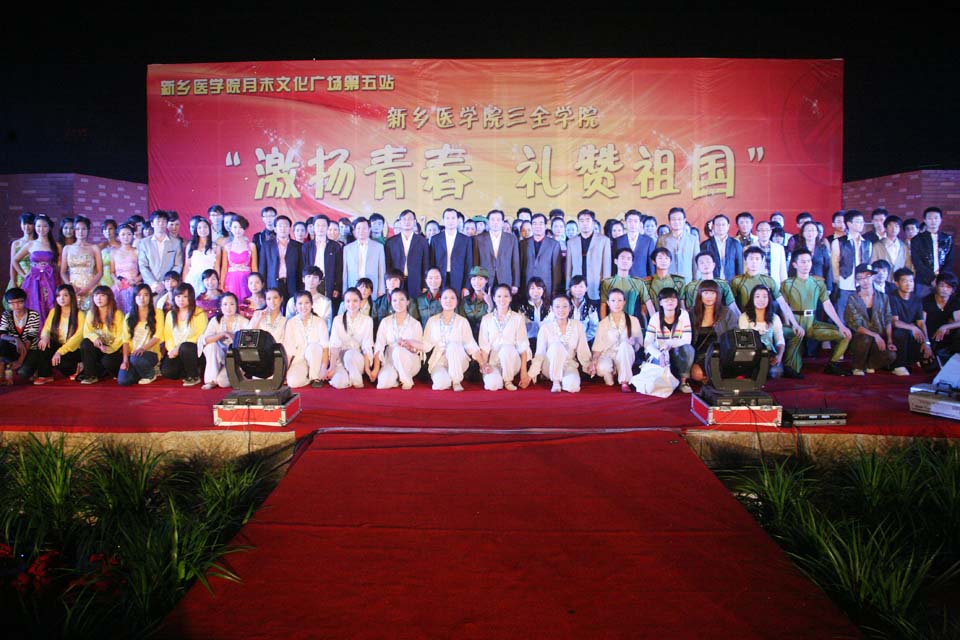 本网讯 9月29日晚,由新乡医学院工会、团委主办,我院团委承办的新乡医学院月末文化广场第五站暨新乡医学院三全学院“激扬青春,礼赞祖国”2011迎新晚会在西区广场浓情上演。新乡医学院领导陈兴华、郭志坤、原志庆及相关部门、院系负责人,我院领导王志凯、杨捷、王金文、秦国亮、王维勋、王彦杰、沈雁霞与2011级本专科新生共同观看了精彩的节目。