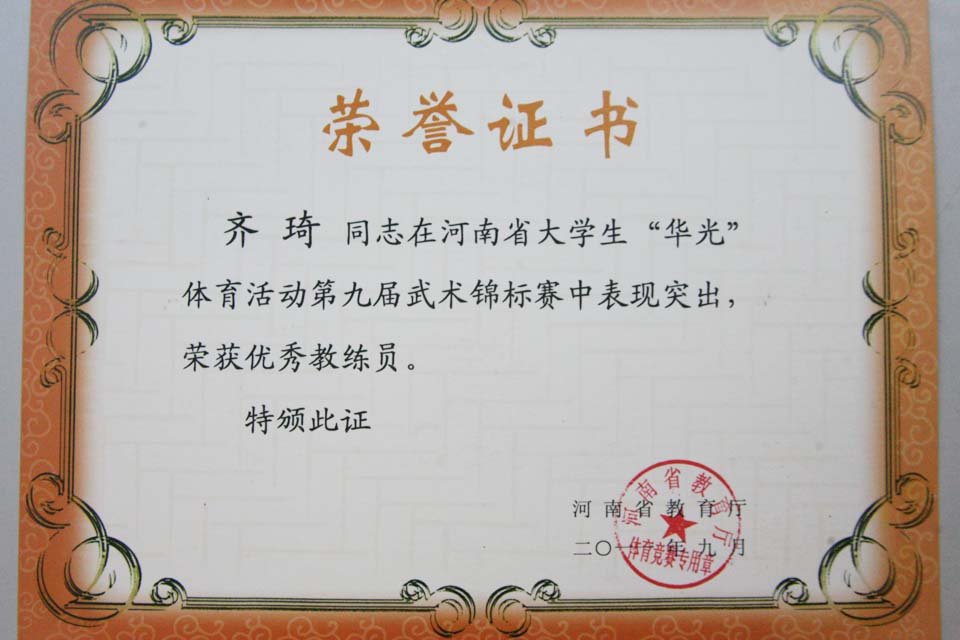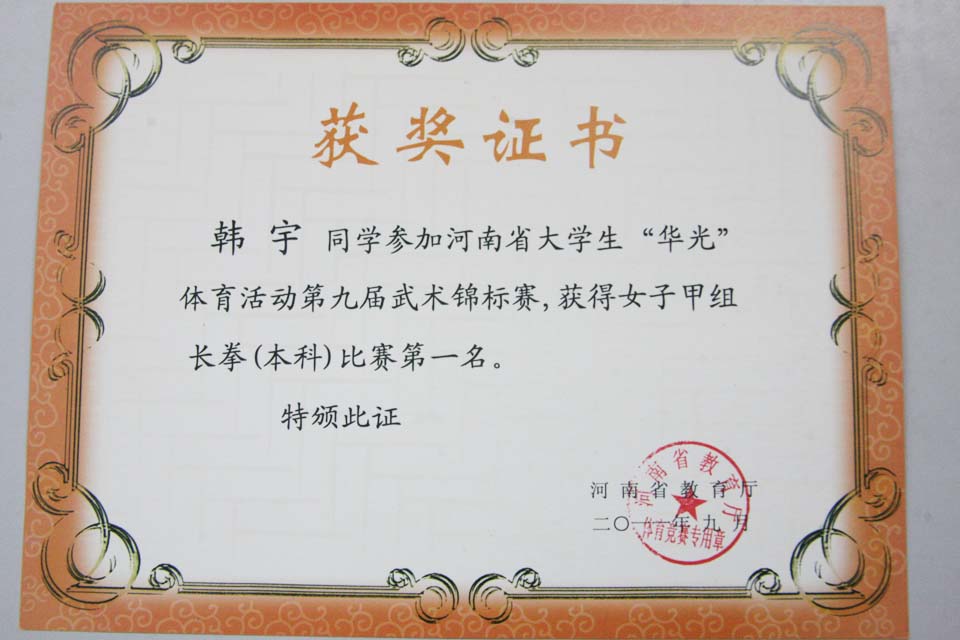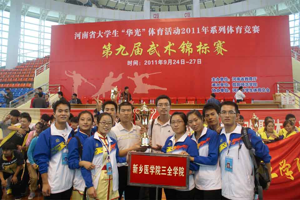 本网讯  927日上午11时,河南省大学生“华光”体育活动2011年系列体育竞赛第九届武术锦标赛在信阳师范学院圆满落幕。我院武术运动队再创佳绩,在河南师范大学、河南科技大学、河南理工大学、信阳师范学院等十六组本科团队中勇获本科甲组团体第一名,取得历史性突破!