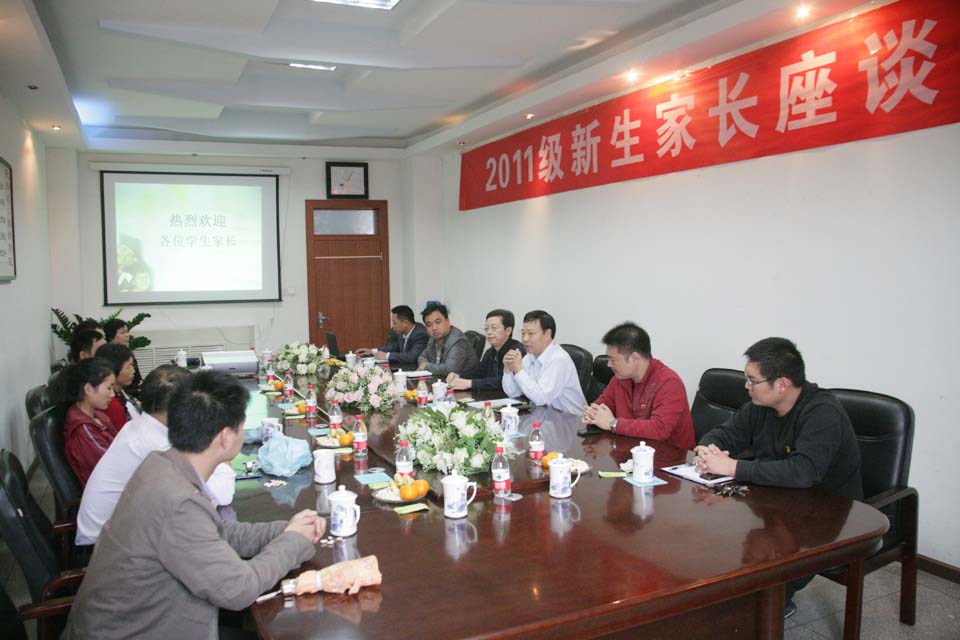 本网讯  为加强学院与家长的沟通,进一步做好迎新工作,918日上午,我院在报到现场邀请部分新生家长召开“2011级新生家长座谈会”。座谈会在西区行政楼二楼小会议室举行,党委书记王志凯、党委副书记王金文出席,学务部主任张钢、教务部主任王洪兴、总务部主任邱永建、院长办公室主任助理袁磊等参加座谈会,会议由王金文主持。