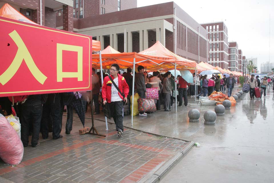 阴雨天气给迎新工作带来许多困难,报到地点转移到问学楼。学务部、团委、教务部、院办、总务部、财务部、资讯中心等部门认真投入迎新的各项工作。学生会、大学生新闻中心、社团联合会的同学热心迎接新生,维持秩序,帮助运送和存放行李,解答入学疑问,并接待家长休息。