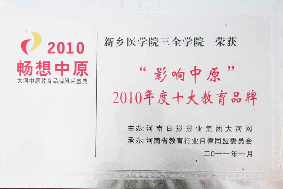 本网讯 3月21日,大河网在河南日报报业大厦举办2010“畅想中原”――大河中原教育品牌风采颁奖盛典,三全学院荣获“‘影响中原’2010年度十大教育品牌”称号,是河南省独立学院中唯一获此荣誉的高校。