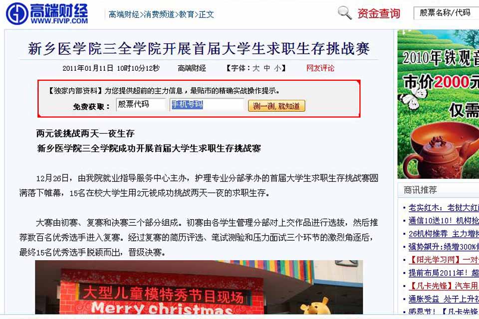 本网讯 2011年1月11日,《高端财经网》在当日《教育》栏目中,以《新乡医学院三全学院开展首届大学生求职生存挑战赛》为题,综合新闻报道我院大学生求职生存挑战赛。12月26日,由我院举办的首届大学生求职生存挑战赛圆满落下帷幕,15名在校大学生用2元钱成功挑战两天一夜的求职生存。