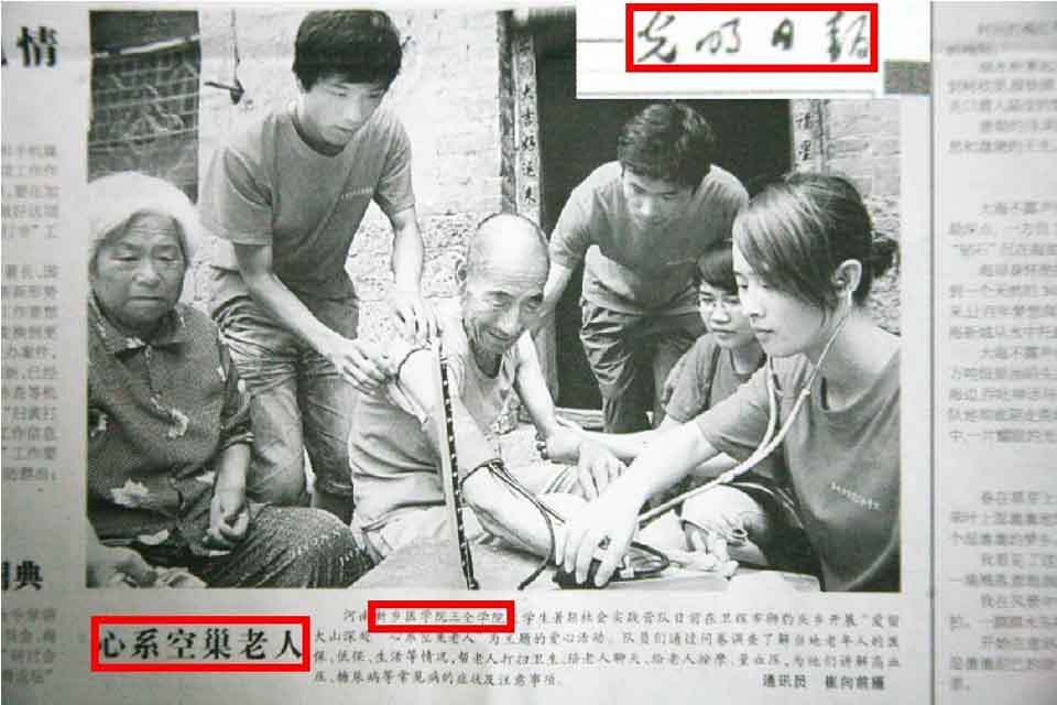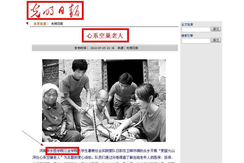 本网讯  725日,《光明日报》、《光明网》以《心系空巢老人》为题,图文报道我院大学生暑期社会实践营队在卫辉市狮豹头乡开展“爱留大山深处 心系空巢老人”为主题的爱心活动。