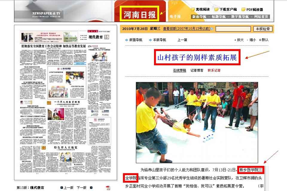 本网讯 7月28日,《河南日报》、《中国网》以《山村孩子的别样素质拓展》为题,图文报道我院暑期社会实践活动。