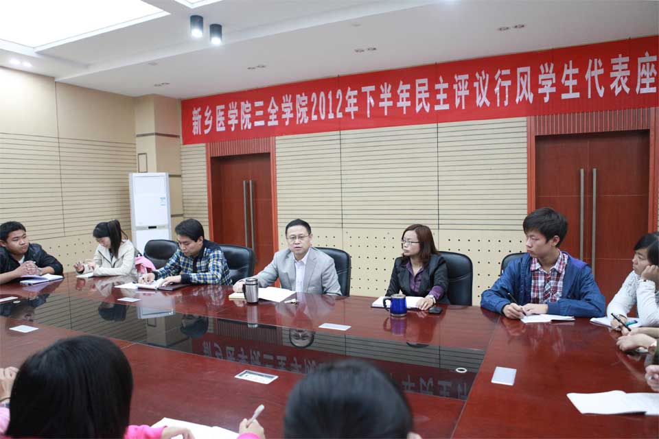 10月25日,我院2012年下半年民主评议行风学生代表座谈会在综合楼三楼会议室举行,杨捷院长与15名学生代表进行面对面交流。院长办公室主任助理蒙晓梅主持。