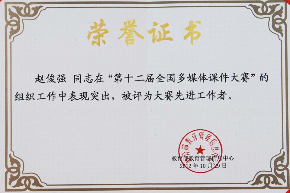 1029日,第12届全国多媒体课件大赛在北京中央财经大学落下帷幕,我院获得全国多媒体课件大赛组织奖,参赛作品《免疫学网络课程》在全国总决赛中脱颖而出,获得一等奖;《X射线》课件获得三等奖;《眼球》获得三等奖,另有9件作品获得优秀奖,赵俊强获得全国多媒体课件大赛先进工作者称号。
