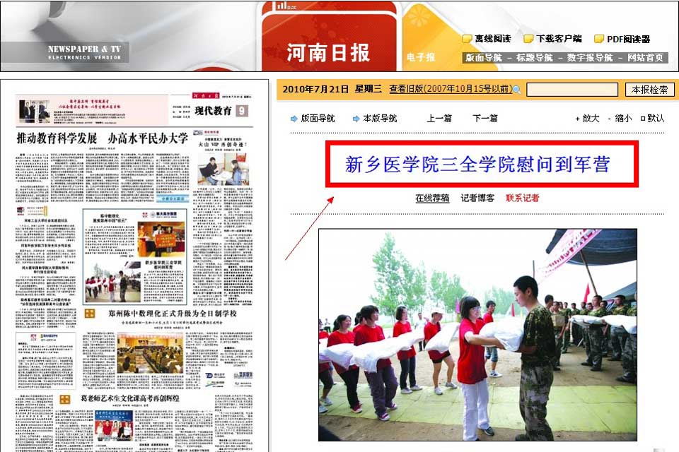 本网讯 7月21日, 《河南日报》以《新乡医学院三全学院慰问到军营》为题,图文报道我院大学生文艺下乡服务队到部队进行文艺演出活动。学院对此次慰问演出活动十分重视,节目均是经过层层选拔、精心编排,具有较高的思想性和艺术性。另外学院还为部队官兵送去了毛巾、肥皂等慰问品,对部队官兵帮助该院圆满完成军训等教育教学任务表示衷心感谢,并对广大官兵致以崇高的敬意和节日的问候。