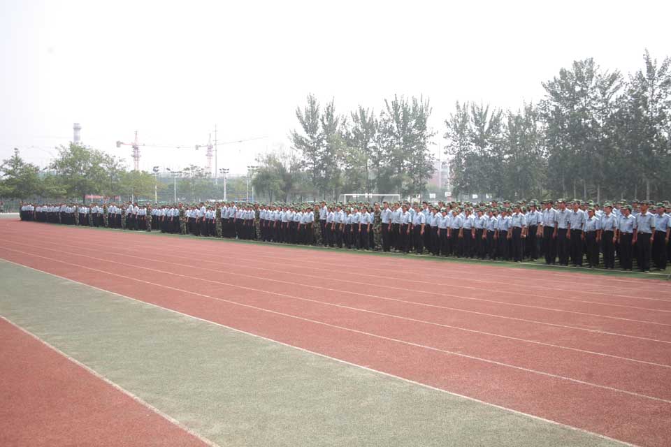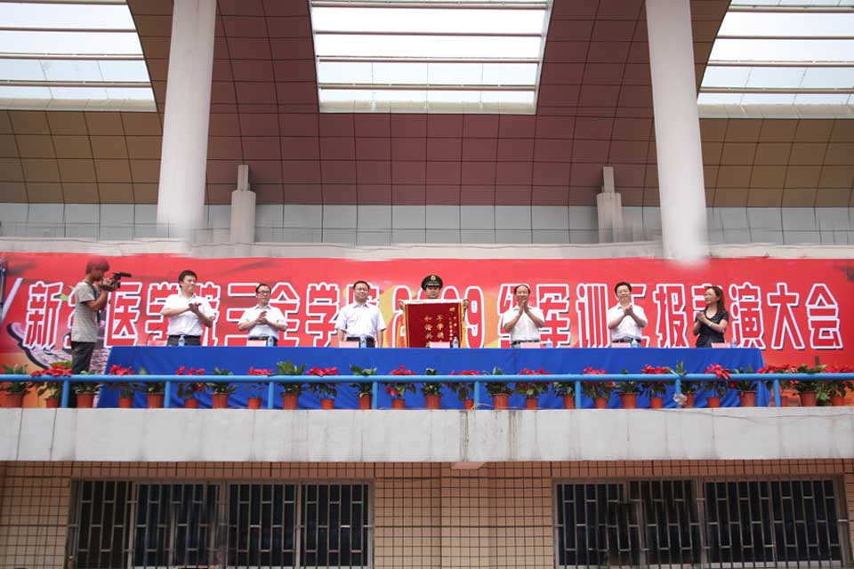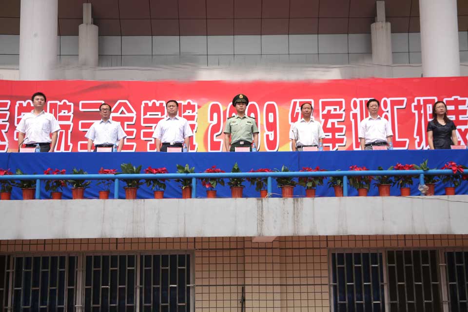 本网讯 为检验2009级学生军训成果,我院于7月14日上午在东区体育场举行2009级军训汇报表演大会。新乡市武警支队参谋长孙红伟中校,我院党委书记王志凯,院长杨捷,党委副书记王金文,副院长王维勋、沈雁霞应邀出席大会,与1800多名师生共同观看了此次汇演。大会由院长办公室主任马波主持。
