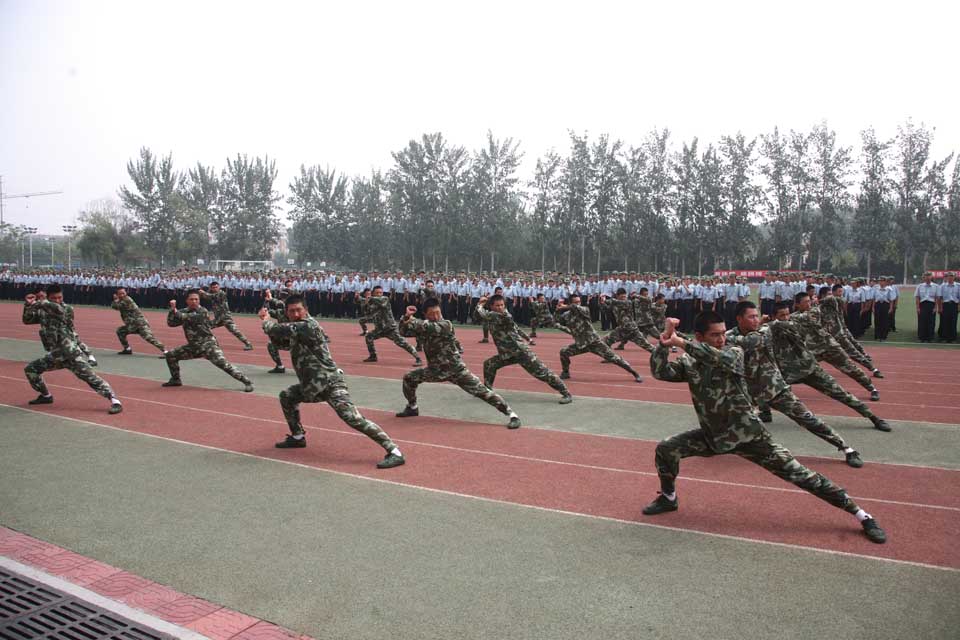 接着,汇报表演正式开始。分列式方队步伐矫健、整齐划一;拉歌方队口号嘹亮、动作新颖;擒敌方队威震会场、斗志昂扬;演习方阵步调一致、英姿飒爽;奋勇无敌、动作利索的教官会演,把会场气氛推向高潮。
