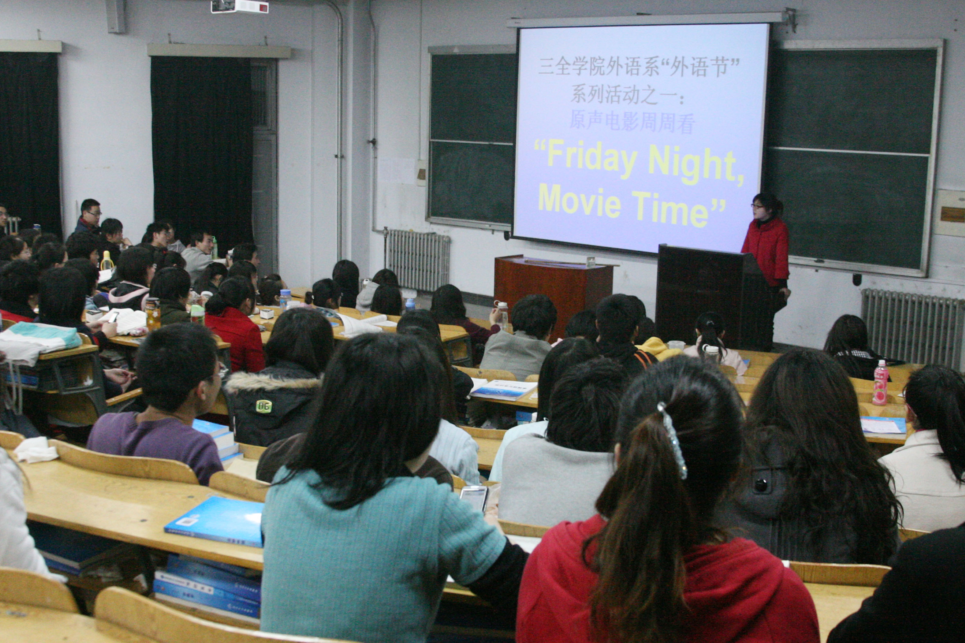 本网讯  由我院外语部主办的第一届外语节特色系列活动之“原声电影周周看”―― “Friday NightMovie Time”于2010310日成功拉开帷幕。本活动定于每周五晚1900开始,在学院西区行政楼第七和第 八大教室播放英文原声电影,电影由外语部教师精心挑选。