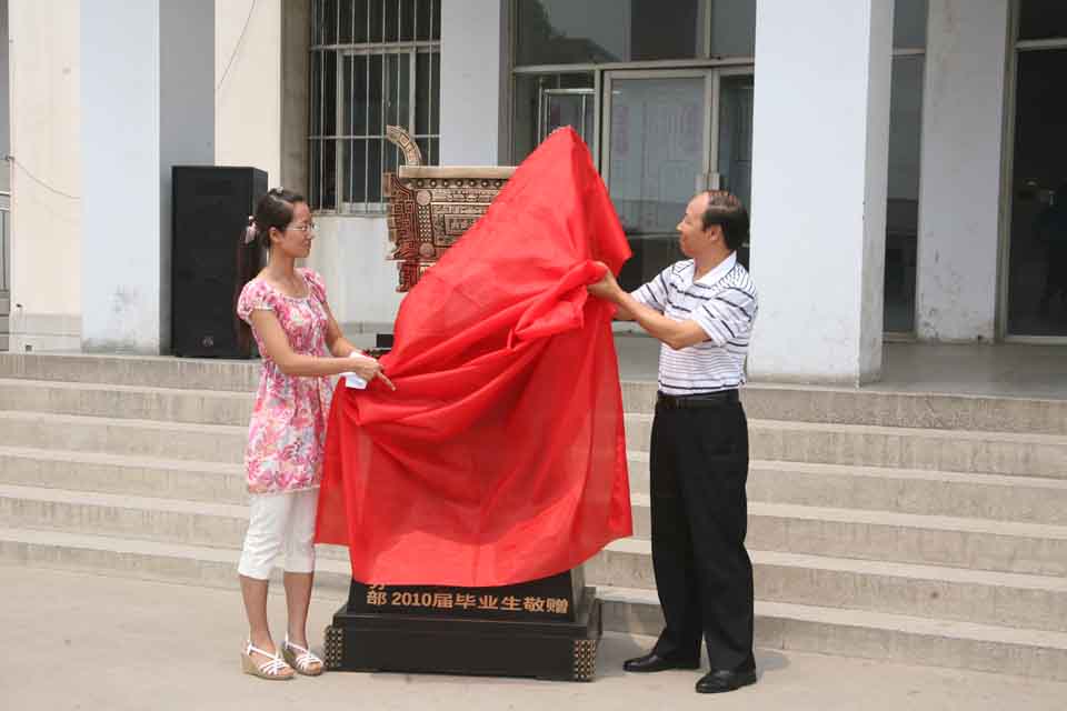 仪式上,王志凯和毕业生代表在热烈的掌声中共同为“鼎盛千秋”宝鼎揭幕。王志凯代表学院向参加捐赠的同学表示由衷的谢意,对同学们的感恩行为给予高度评价,并希望毕业生保持远大志向,努力工作,为社会发展做贡献;同时也希望毕业生心系母校,继续关注母校、支持母校、宣传母校,在以后的工作、学习中为母校增光添彩,搭建起母校与社会的座座桥梁,并祝愿2010届毕业生前程似锦。