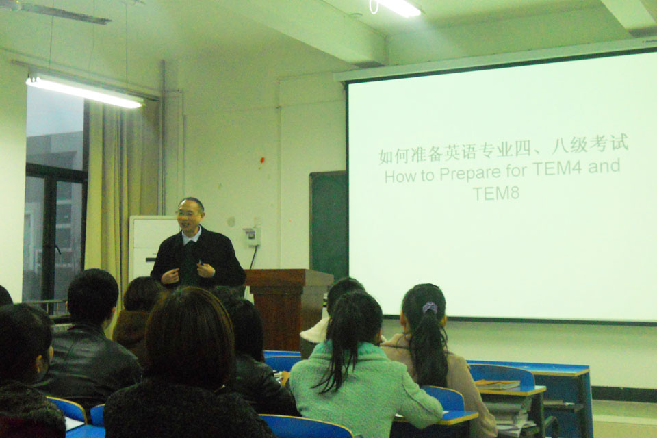 为了使学生从容应对即将到来的英语专业四八级考试,3月14日晚,由外国语言学系举办的“如何准备英语专业四,八级考试”专题讲座在问学楼205教室举行。该讲座特别邀请我系学术顾问、郑州大学硕士生导师叶定国教授担任主讲。