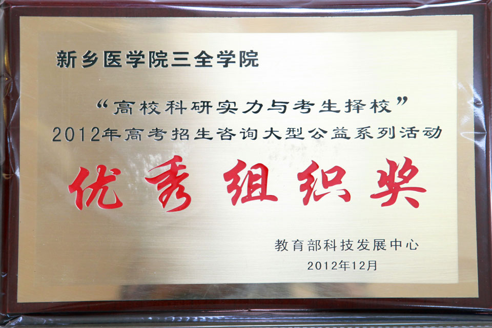 近日,我院获教育部科技发展中心颁发的“‘高校科研实力与考生择校’——2012年高考招生咨询大型公益系列活动优秀组织奖”。