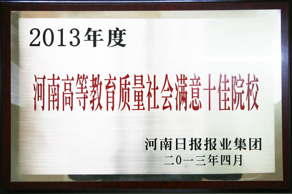 4月26日上午,第四届河南高等教育高峰论坛在郑州大河公馆多功能厅举行,我院荣获“2013年度河南高等教育质量社会满意十佳院校”。