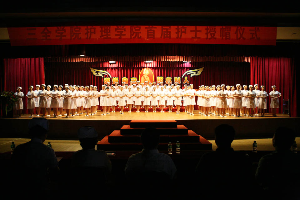 仪式在近百名护理毕业生伴随《爱因为在心中》歌曲的手语表演中拉开帷幕。首先,杨捷致辞。他说,授帽仪式是一次心灵的洗礼,是一份责任的传递,是一种庄严的承诺,更是一个梦想的开始。鼓励毕业生真诚的热爱护士职业,全身心地投入到护理职业,坚持播撒爱的种子,只要努力,护理事业的明天一定是属于你们的。并衷心祝福毕业生天使们,在未来的日子是越美丽、越幸福,直到永远。他的讲话,字字发自肺腑,句句透着诤言,寄托着母校对学子的厚望与祝福。随后,毕业生代表陈燕致辞,她满怀深情地把四年来与三全、与护理的情感发展进行诉说,处处表达与对母校的感恩与不舍,表示将不负母校重托,在平凡的岗位上坚守护理职业道德,把真诚而无私的爱奉献给每一位病人,为促进人类健康事业奉献青春与热血。