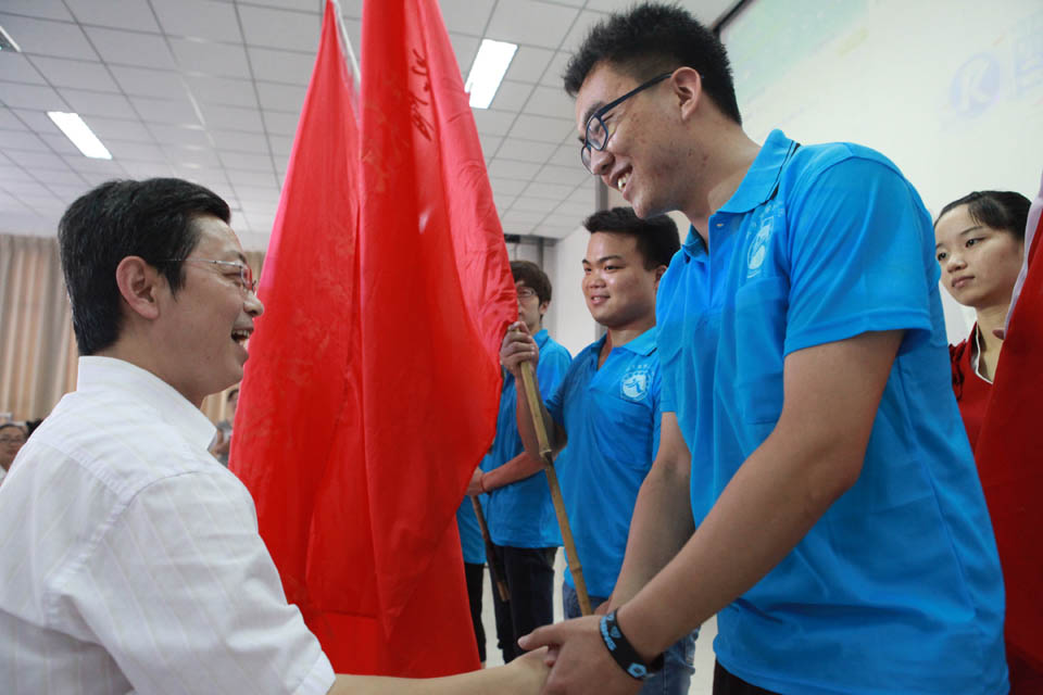 仪式开始,王志凯发表重要讲话。在讲话中,他对学院各院系进行社会实践给予肯定并寄予厚望,并提出五点希望和要求:一、要通过实践,进一步坚定中国特色社会主义道路的理想和信念;二、要在艰苦环境中磨炼意志品质,增强服务社会的本领;三、要谦虚谨慎,在向实践和群众学习中增长才干;四、要精心组织,确保实践活动安全有序进行;五、要注重宣传,塑造品牌,做好成果总结。接下来,社会实践团队指导老师代表常青和学生代表牛含青分别发言,她们从老师和学生的角度明确社会实践的角色要求和工作原则,承诺严格按照院领导部署,把时时作为锻炼之机,把处处作为锻炼之地,与时俱进,开拓创新,积极投身大学生暑期社会实践活动中。随后,进行授旗仪式。由王志凯和王金文对社会实践团队队长授旗。