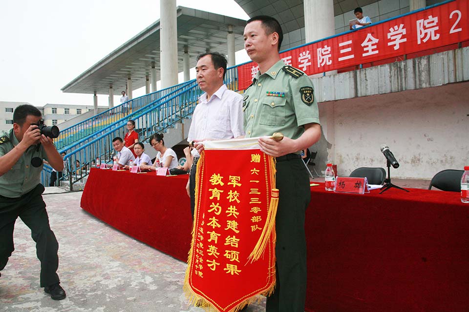 王维勋代表学院向61330部队赠送了“军校共建结硕果,教育为本育英才”的锦旗,并对全体教官和工作人员表示衷心的感谢,向顺利通过这次军训严格训练的同学们表示热烈的祝贺。他充分肯定了此次军训的训练成果,高度赞扬了教官和学员们在军训中所表现出的坚韧品质和刻苦精神,希望同学们把军训时锤炼的精神品格,不断内化为成长的动力。鼓励同学们在以后的学习过程中永葆这种坚忍不拔,勇于吃苦,勤奋努力的精神风貌,在美丽的大学校园里,多方面发展自己,让三全学院真正成为优秀学子梦想腾飞的殿堂。