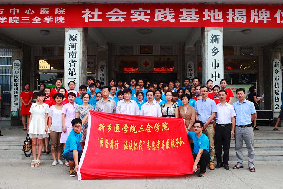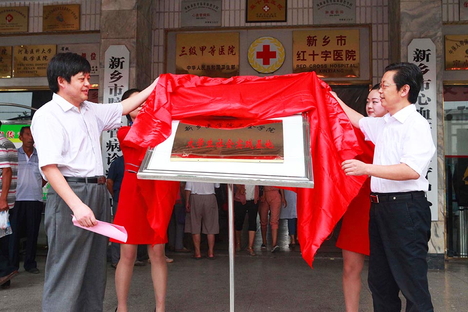 7月15日上午,临床学院暑期社会实践基地揭牌仪式在新乡市中心医院门诊大楼前举行。新乡市中心医院领导与我院领导对此次实践基地的建立给予了高度重视。出席本次揭牌仪式的有我院党委副书记王金文、新乡市中心医院副院长王培山,我院团委书记王俊萍、市中心医院团委书记宋予伟,我院临床学院党总支副书记徐超以及临床学院参加“医路前行,温暖你我”导医活动的全体队员。
