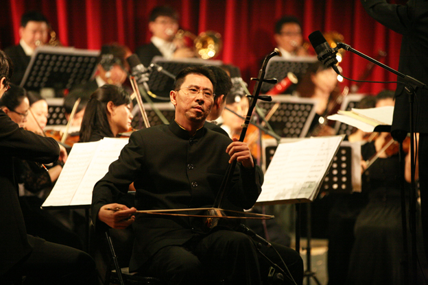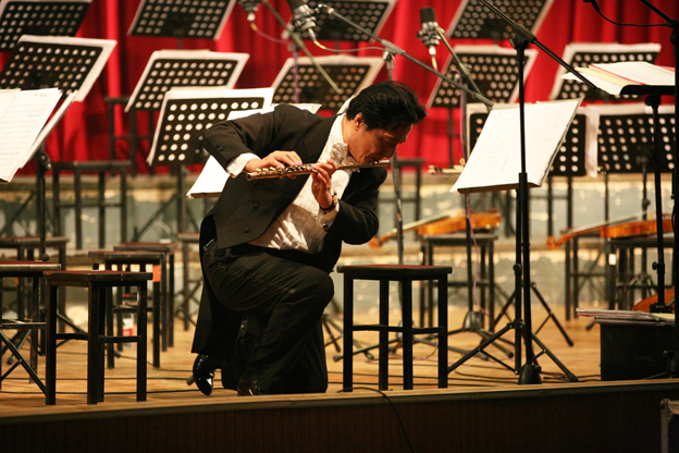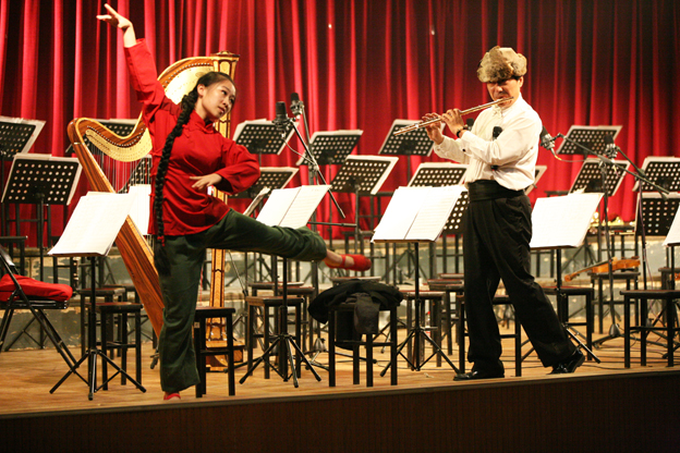 19点,演出由《春节序曲》拉开帷幕,交响乐团华丽的场面震惊了在座的所有观众,已70高龄的岳辉先生向同学们展示了专业的高水平指挥,二胡演奏家郭民老师用自己的乐器让大家感受到了曹操的戎马一生,长笛演奏家董世英老师与我院大学生艺术团舞蹈队员共同演绎了白毛女选段。