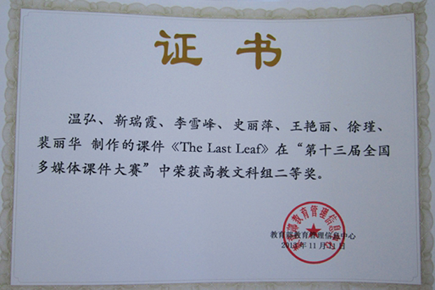 我院温弘、靳瑞霞、李雪峰老师的作品《The Last Leaf》在全国决赛以优异的发挥,获得二等奖,是我院首个文科类大奖。我院杨慈清、李小英、石晓卫老师在北京决赛,作品《DNA复制、RNA转录和蛋白质翻译》获得三等奖,王静(微课程)、鲁世清、张业宏、白瑞樱、张光谋、高启禹、李勇莉的7件作品获得全国课件大赛优秀奖。