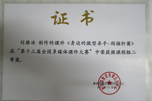 我院于今年5月举办第四届教育教学信息化大赛(前三届为多媒体教育软件大赛),选拔作品参加河南省第十七届教育教学信息化大赛和第十三届全国多媒体课件大赛,经过进一步选拔和提炼共有10件作品上报参加第十三届全国多媒体课件大赛,3件作品入围决赛,7件作品获优秀奖。其中大学生刘雁冰的微课程《身边的微型杀手-结核杆菌》在教育技术中心程巍老师的指导下以新颖的选题,先进的技术,流畅精美的画面,翔实丰富的内容,注重公益教育事业的角度制作,在全国大赛中获得评委的肯定,从作品中脱颖而出获得二等奖,创造了我院微课程在全国大赛获大奖的历史。