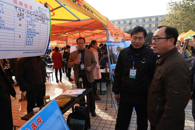 11月16日,2014届河南省医学卫生类大中专毕业生就业双向选择洽谈会(冬季)在新乡医学院南校区隆重举行。本次洽谈会共吸引了来自省内外的346家用人单位前来参加,涵盖临床医学、护理、医学影像学、药学、生物工程、英语等多个专业,共提供就业岗位8134个。全省医学院校4000余名医学卫生类毕业生参加了洽谈会。我院副院长王维勋亲临洽谈会现场,看望求职学生及用人单位,亲切询问了参会同学们的求职状况,并且与用人单位的工作人员进行了交谈,了解各单位对人才的需求现状,以及对学校人才培养的意见和建议。