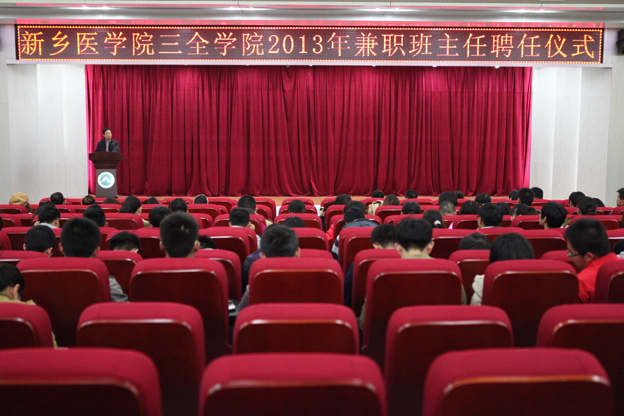 本次兼职班主任选聘工作是继我院在基础医学院开展首批兼职班主任试点工作后在各院系2013级全体班级中的全面推广。此次选聘为我院8个院系的132个2013年新入学班级配置了69位同志担任兼职班主任。仪式上,张钢宣读了《新乡医学院三全学院班主任工作条例》,王金文宣读了《关于聘任苗莹莹等69名教师担任兼职班主任的决定》,各院系党政领导分别为本院系新聘兼职班主任颁发了聘书。