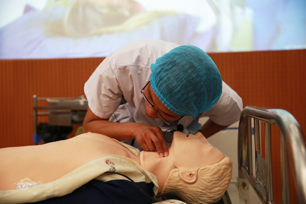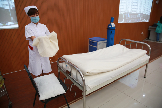 参赛教师开始技能展示。本场比赛采取仿真模拟竞赛的形式,15位参赛选手,五人一组,共分为三组。比赛分为铺床法、密闭式静脉输液法、双侧鼻导管氧气输入法、单人徒手心脏复苏术以及多功能心电监护仪的使用等五个项目。竞赛从仪表礼仪、专业技能操作、人文关怀、团队配合以及模拟情景设置的合理性等方面对选手进行立体化评价。选手们熟练地进行操作,充分展示了白衣天使的良好风貌。