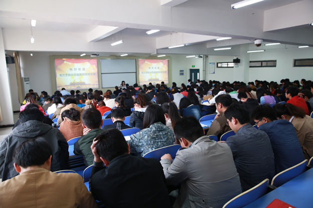 随后,毛兰芝在第一教学楼B301教室为全院师生党员作《坚持党的群众路线,全力做好评建工作》专题辅导报告。她结合“焦裕禄精神”和“习近平重返兰考”等新闻事例,深入翔实地论述了群众路线和开展党的群众路线教育实践活动的重要意义,阐述了党的群众路线的定义、发展历程、核心内容、新形势下党的群众路线的内涵、重要意义以及如何以群众路线教育实践活动指导学院各项工作。